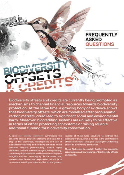 This document explains the answers to some of the most important questions regarding biodiversity offsets and credits, from what they are to why they are deeply problematic as tools for biodiversity protection. These approaches fundamentally misunderstand the uniqueness and complexity of ecosystems, making the idea of substituting one ecosystem for another scientifically unsound and ethically questionable. The report warns that biodiversity credits are likely to be used almost entirely for offsetting rather than voluntary conservation, echoing the failures of carbon markets. It also highlights that these markets benefit corporations, banks, and intermediaries while providing little benefit to local communities or Indigenous Peoples, and can lead to land grabbing, displacement, and conflicts over tenure rights. The FAQs critique the technical flaws of offset and credit systems while calling for alternative solutions that avoid the commodification of nature, like redirecting harmful subsidies, enforcing strong environmental regulations, and prioritizing grants and direct funding for Indigenous Peoples and community-led conservation initiatives.